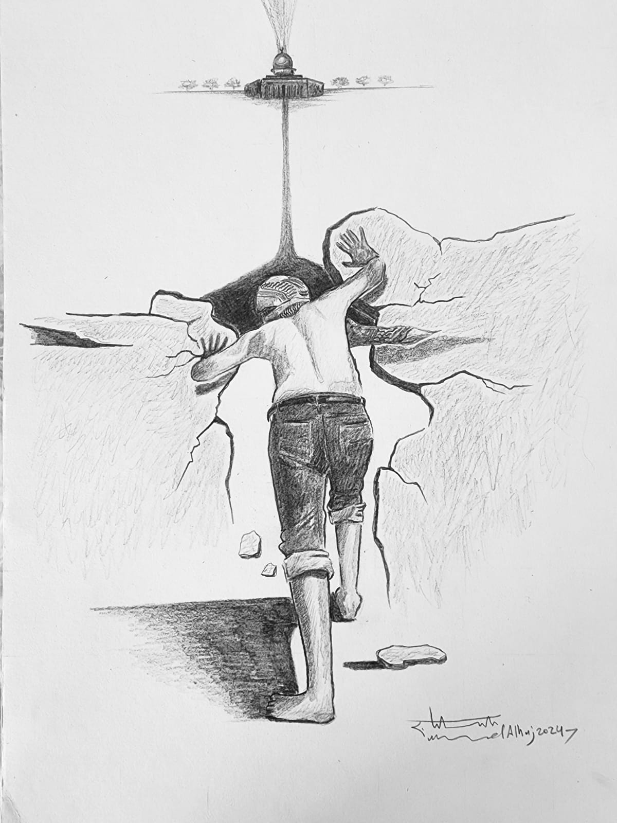 His latest project, Abu Al-Kufiya (2025), consists of twenty-four drawings that constitute a visual testimony to fragmentation and identity through symbolic and expressive images rooted in the current reality of Gaza. The project raises questions about the persistence of Palestinian displacement, the experience of marginalization and rejection globally, and the uncertain fate facing Palestinians after decades of repeated catastrophes.